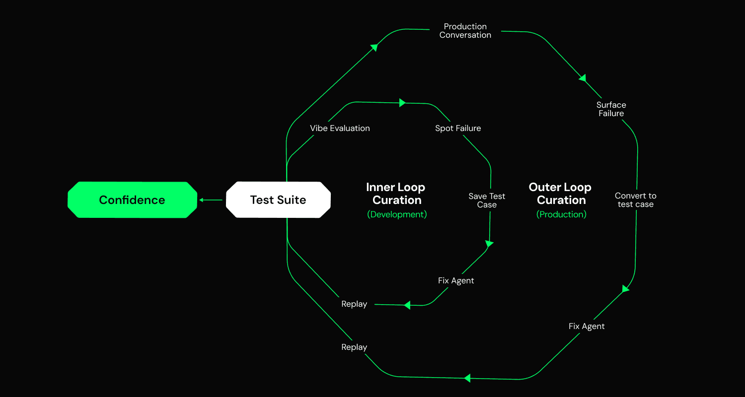 Inner loop curation is what happens during development. As teams test and iterate, Quraite helps them capture test cases in the moment. A failed conversation becomes a deliberate improvement - not something you forget by the next sprint.